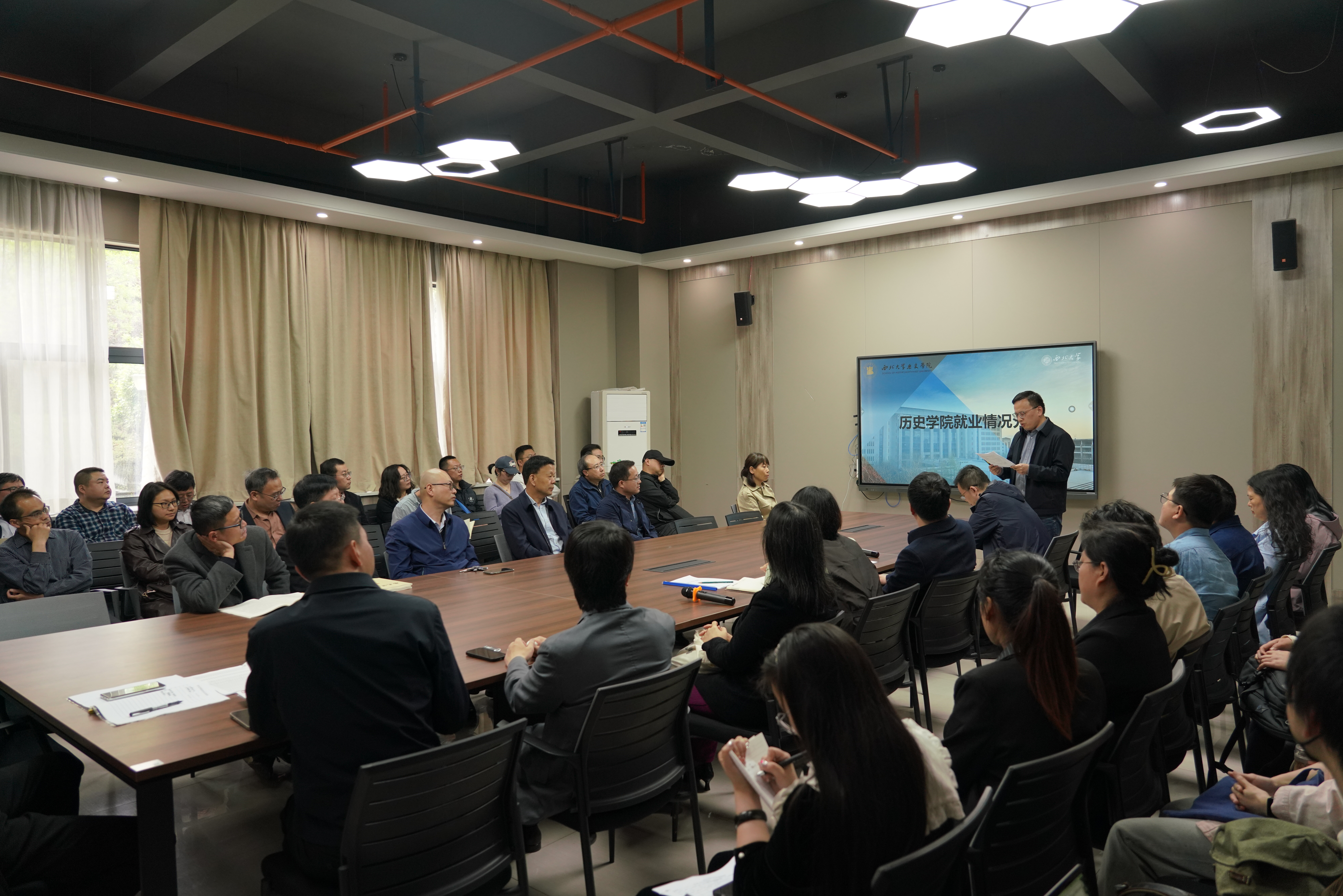 院长李军介绍了《西北大学促进毕业生充分就业的九条措施》的政策要求,从调整学院本科专业设置、开展毕业生的就业指导等方面,向与会人员介绍了目前已开展的工作;同时希望各教职员工能积极挖掘校友资源,为毕业生就业提供力所能及的帮助。