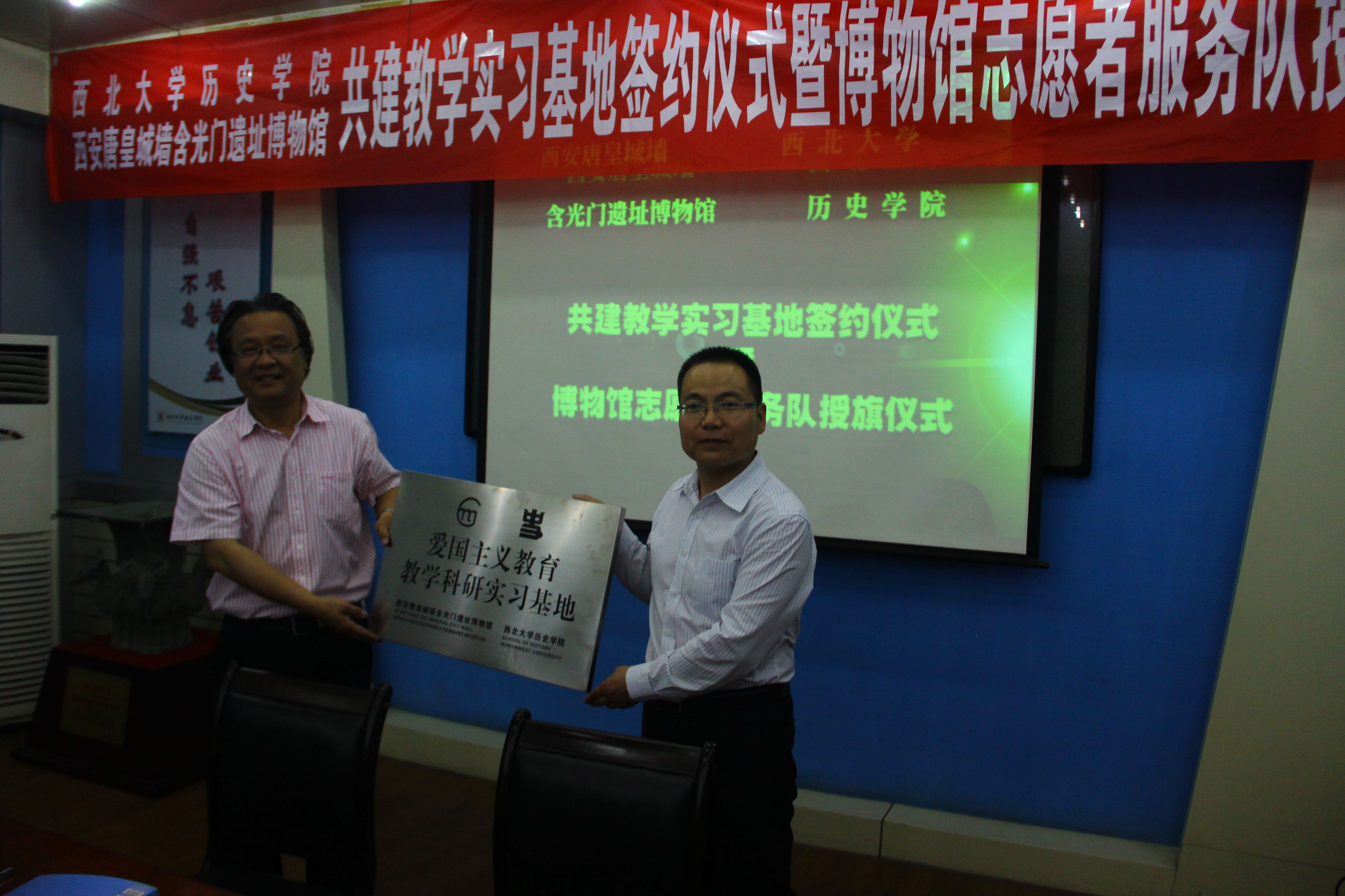关于本次签约仪式,首先由博物馆副书记进行讲话,后由我校王新刚老师讲话,内容主要是回顾我校历史以及和含光门博物馆的友好往来,气氛十分的友好融洽。随后,是授牌仪式,接着是授旗仪式,均由志愿者代表翟佳明和陈豪同学参与。最后,全体人员合影留念。仪式圆满落幕。