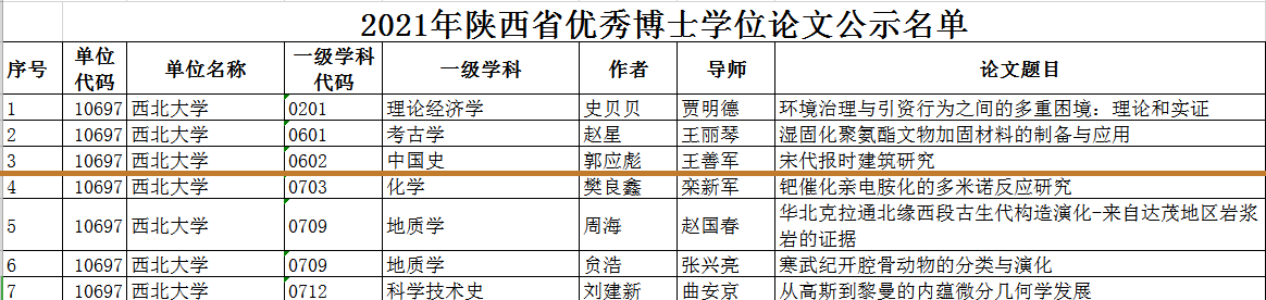 根据《关于对2021年陕西省优秀博士学位论文评选结果进行公示的公告》,我院王善军教授指导的博士毕业(学位)论文《宋代报时建筑研究》,被评为2021年陕西省优秀博士学位论文,充分显示了我院中国史研究生培养的成效。